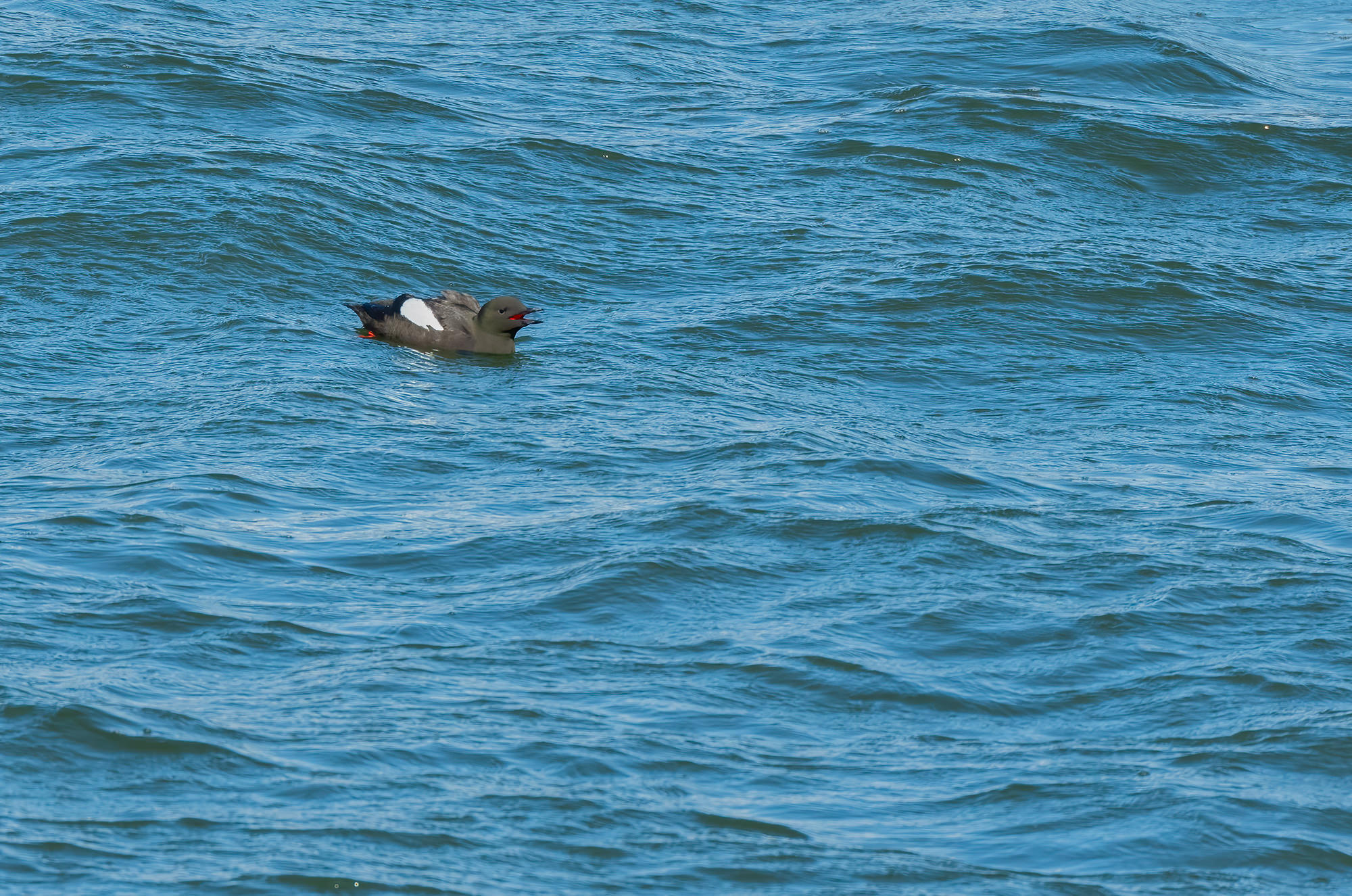 My first proper encounter with a black guillemot was, as is so often the case with seabirds, a distant sighting. On a bright, sunny day in April 2022, I was strolling along the Clyde walkway at Port Glasgow with my partner when I noticed a black bird bobbing around on the water before diving below the surface. It was far from the shore, but through my lens I recognised it as a black guillemot. I captured a few images, including one with its beak open, revealing its bright red gape. For me, this was a rare sighting – one I was delighted with – but beyond processing the images afterwards, I didn’t think much more about it.